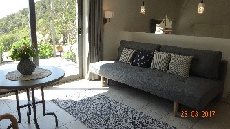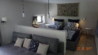 The layout is open plan (50 sqm) with a bedroom with a double bed, a double sofa bed. Outside there is an additional bed for sleeping.