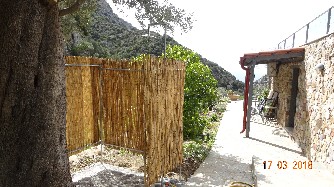 There is a small covered terrace and a larger one with a bougainvillea.